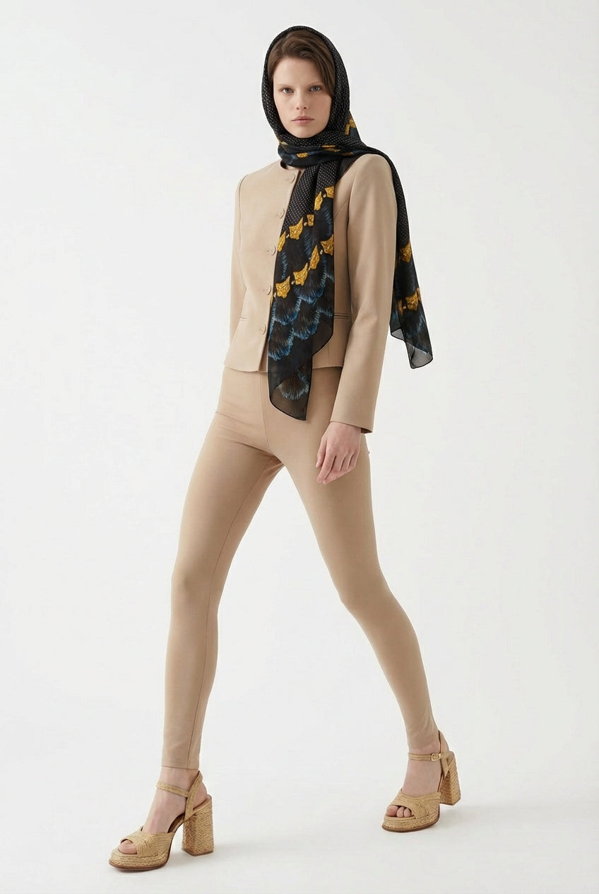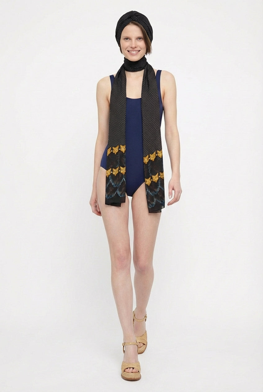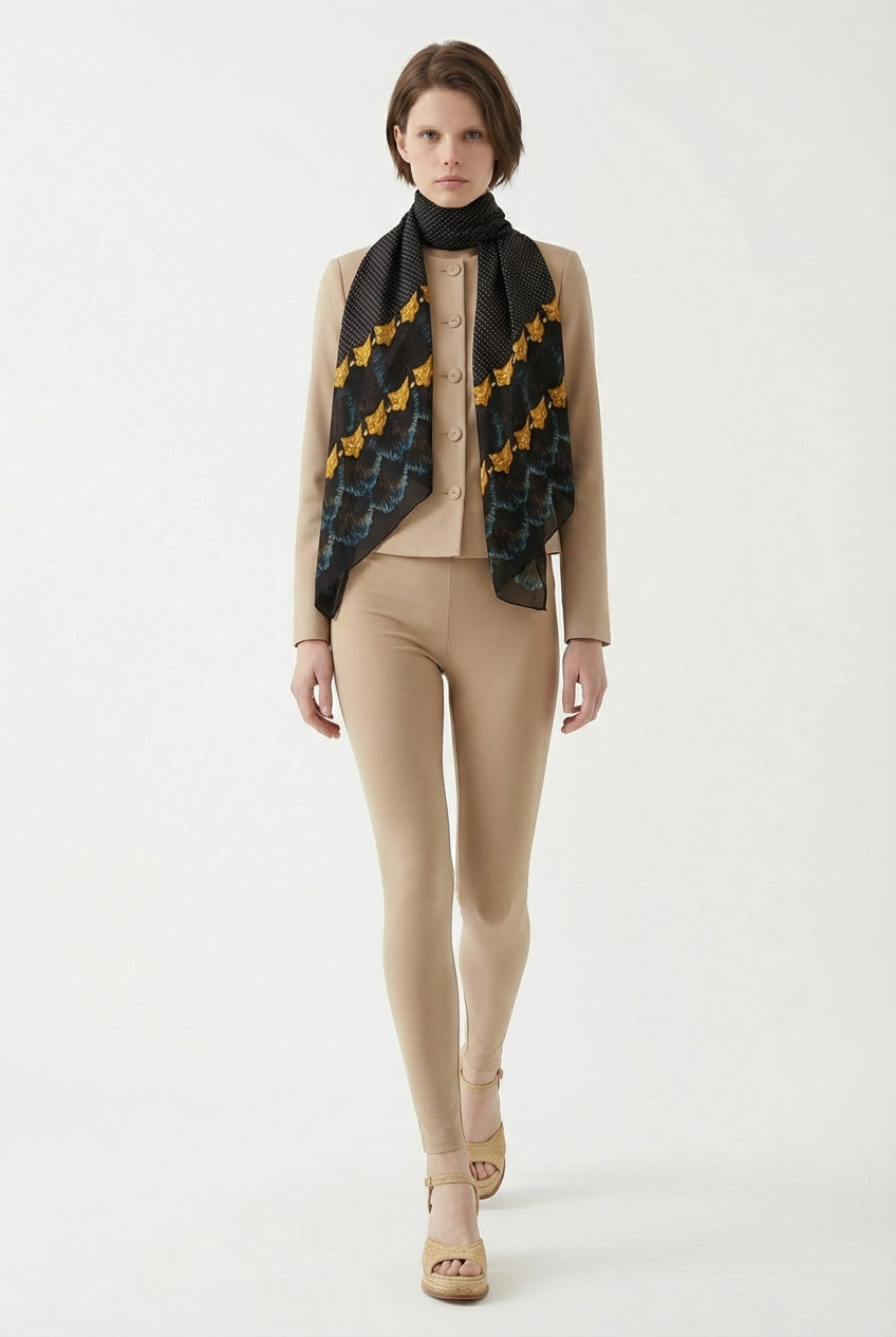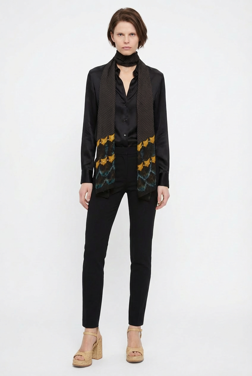 High artistic quality limited edition scarf with a jewellery print of golden wolf masks. Silk georgette is 100% natural yarn. The prolongated shape allows to wear it as a fashionable tie-style, or a blouse-effect (showing an edge from an upper layer jacket or cardigan).